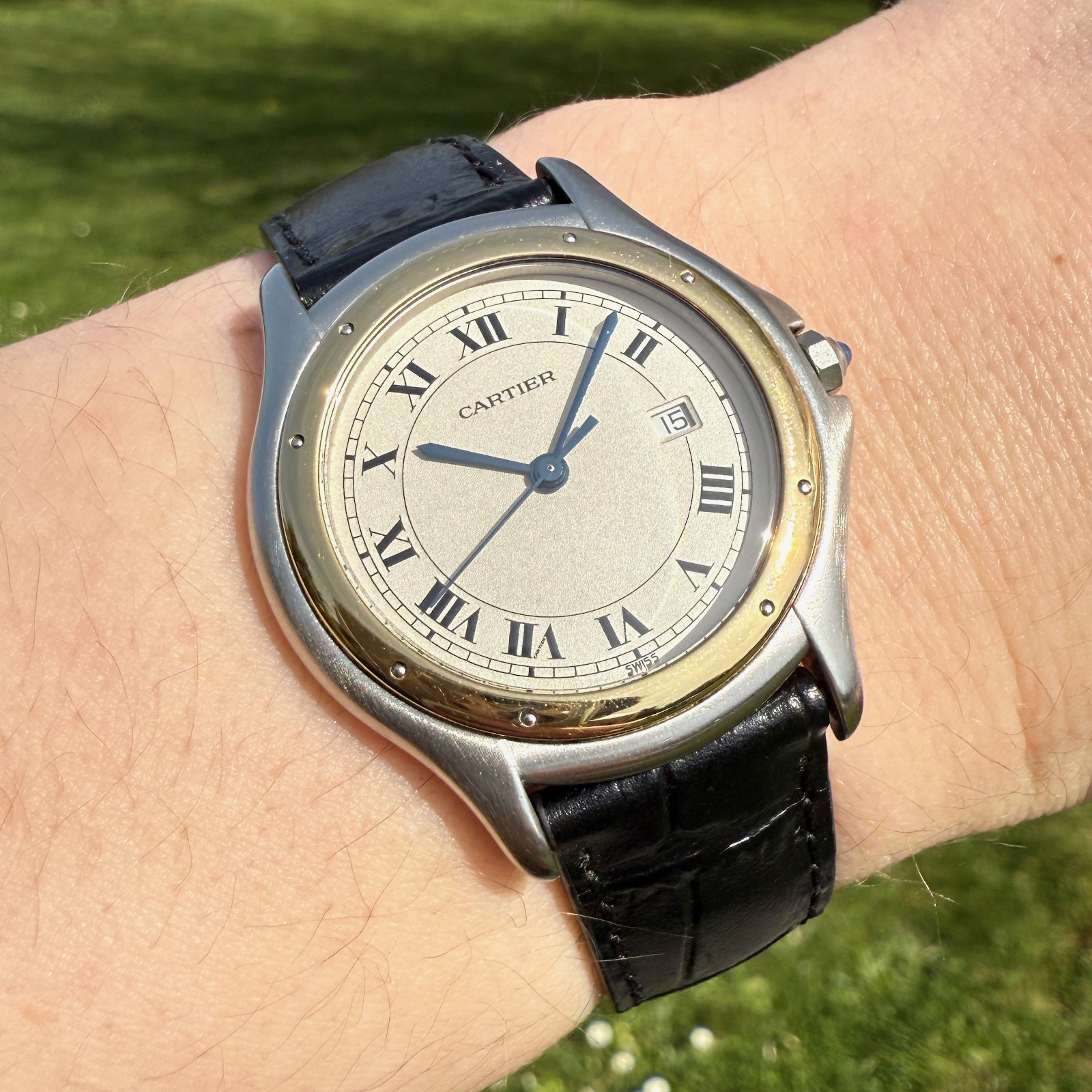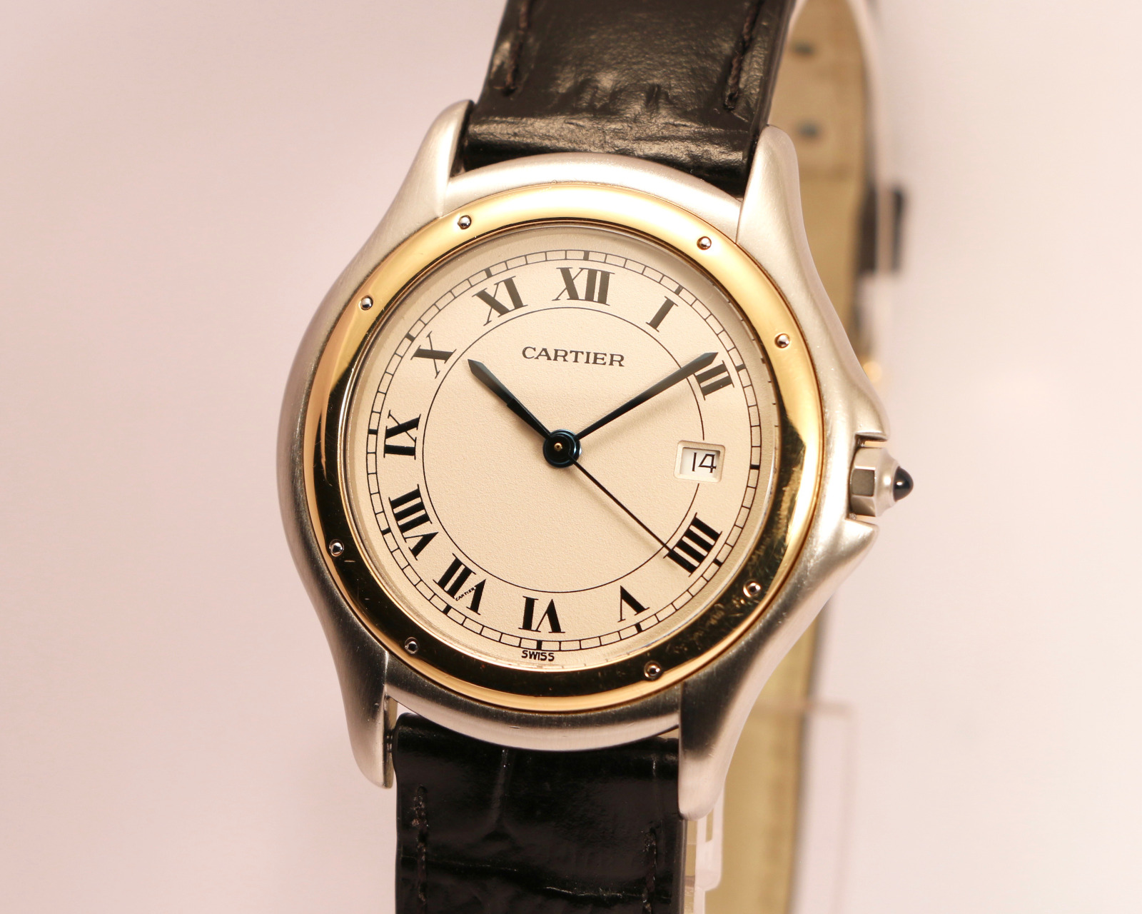 Champagne dial with Roman numerals and date.