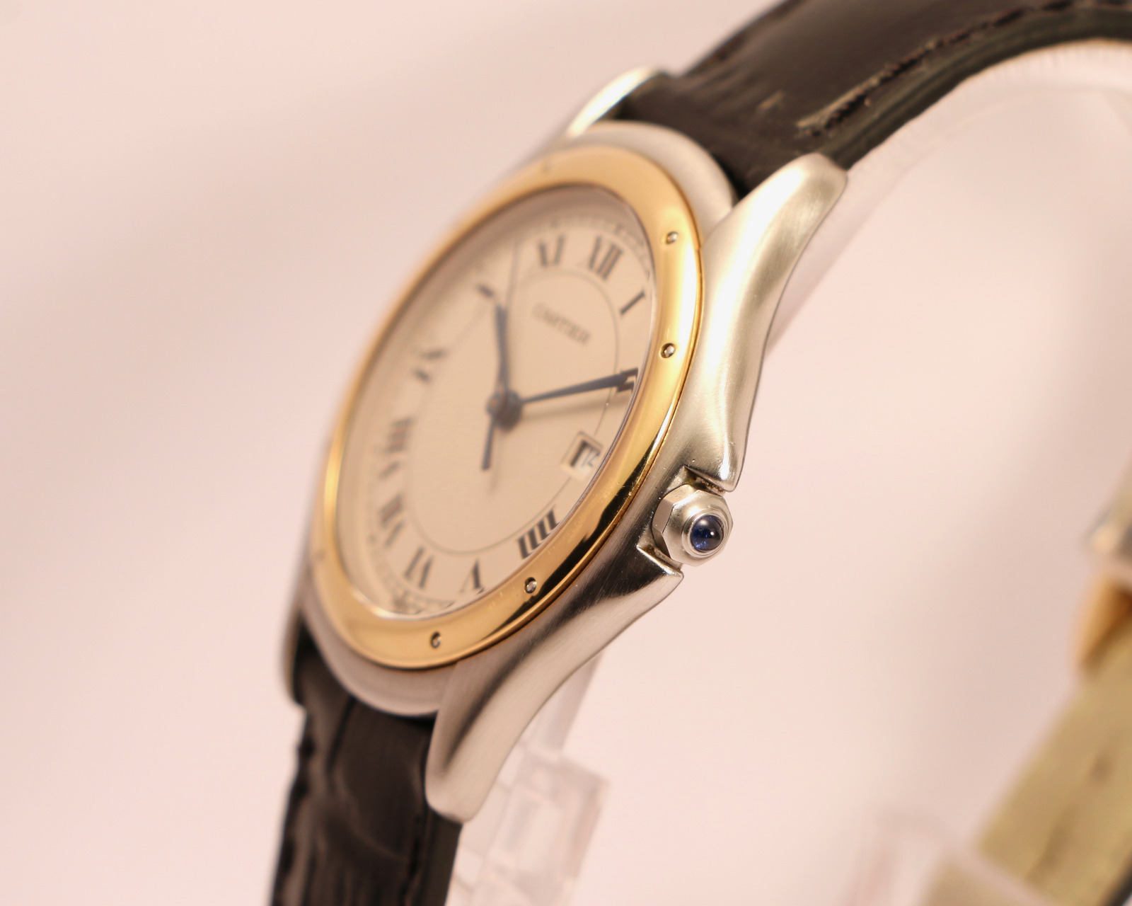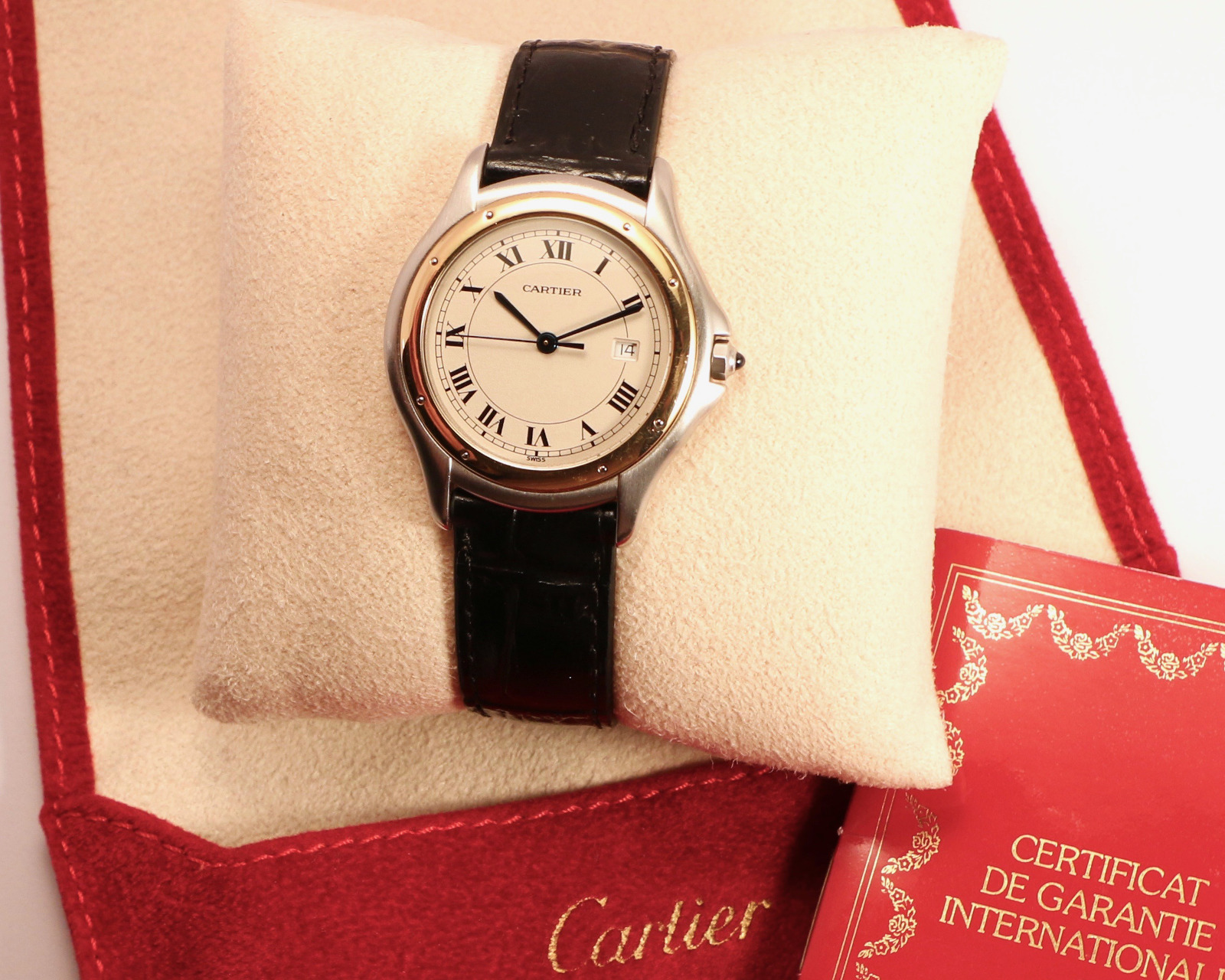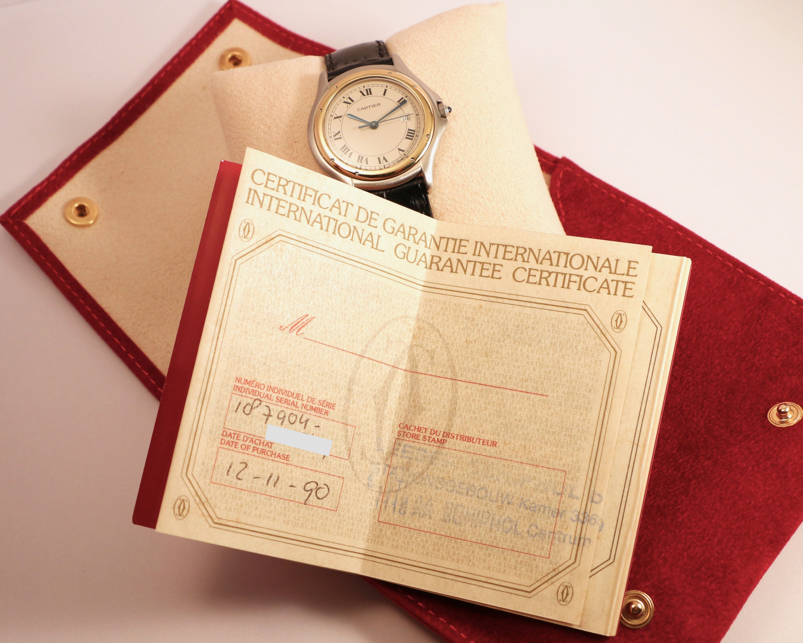 The watch comes with its red Cartier pouch and original papers dated November 12, 1990.