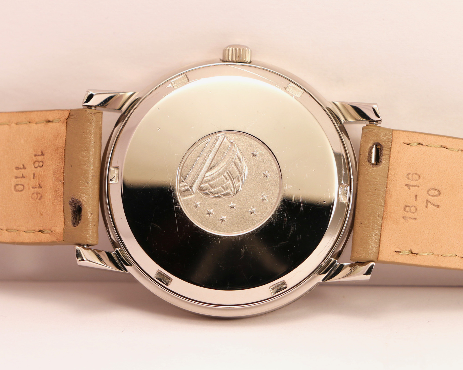 Unpolished steel case. Screw-in caseback with a medallion in the center depicting the Observatory of Geneva.