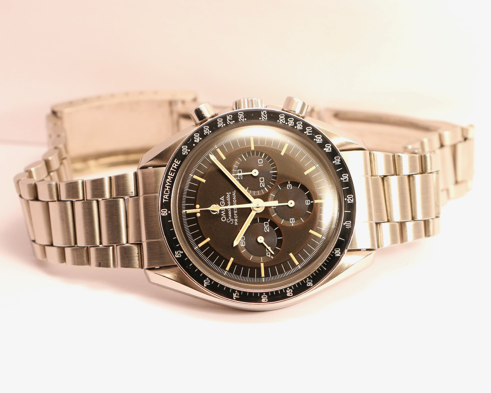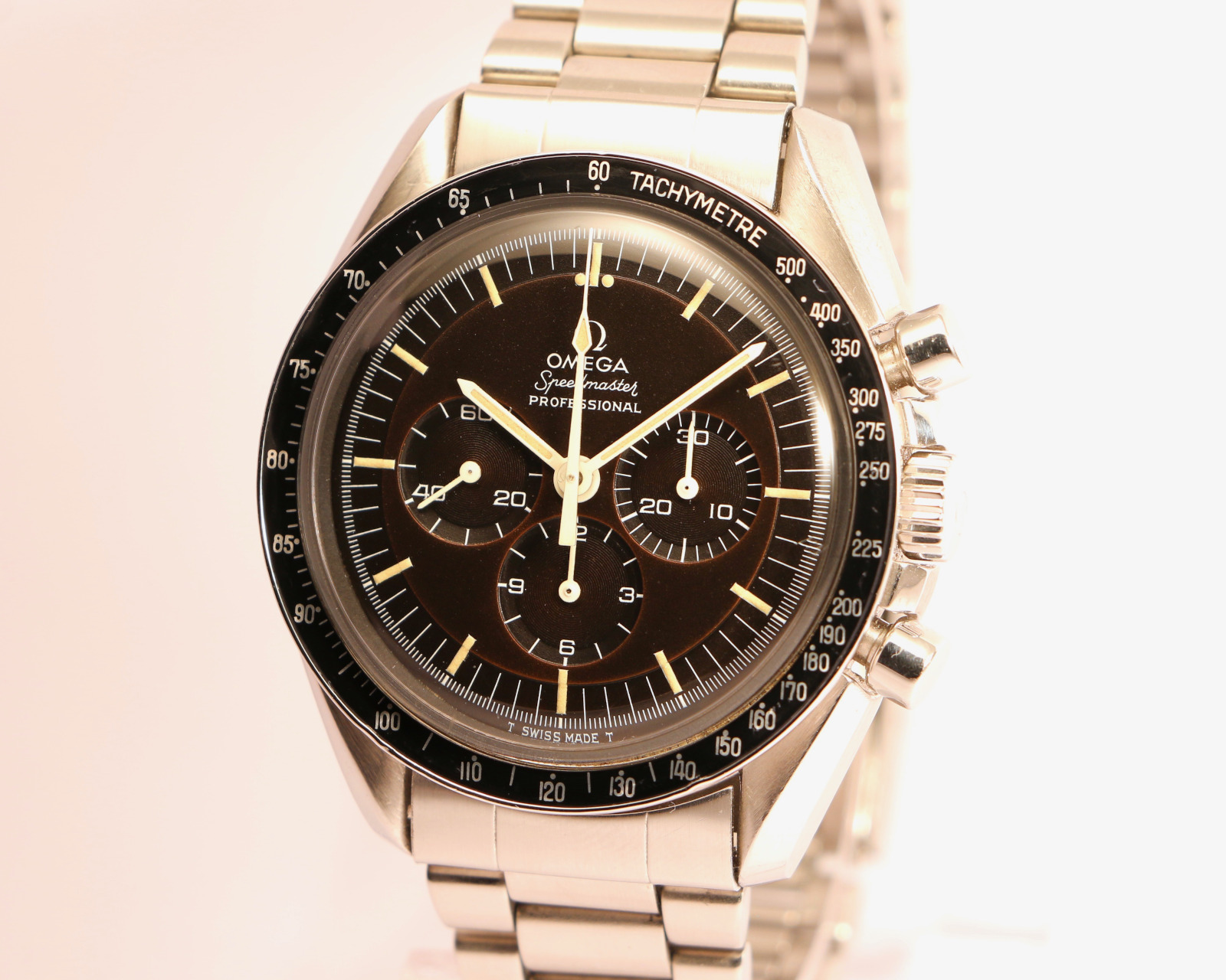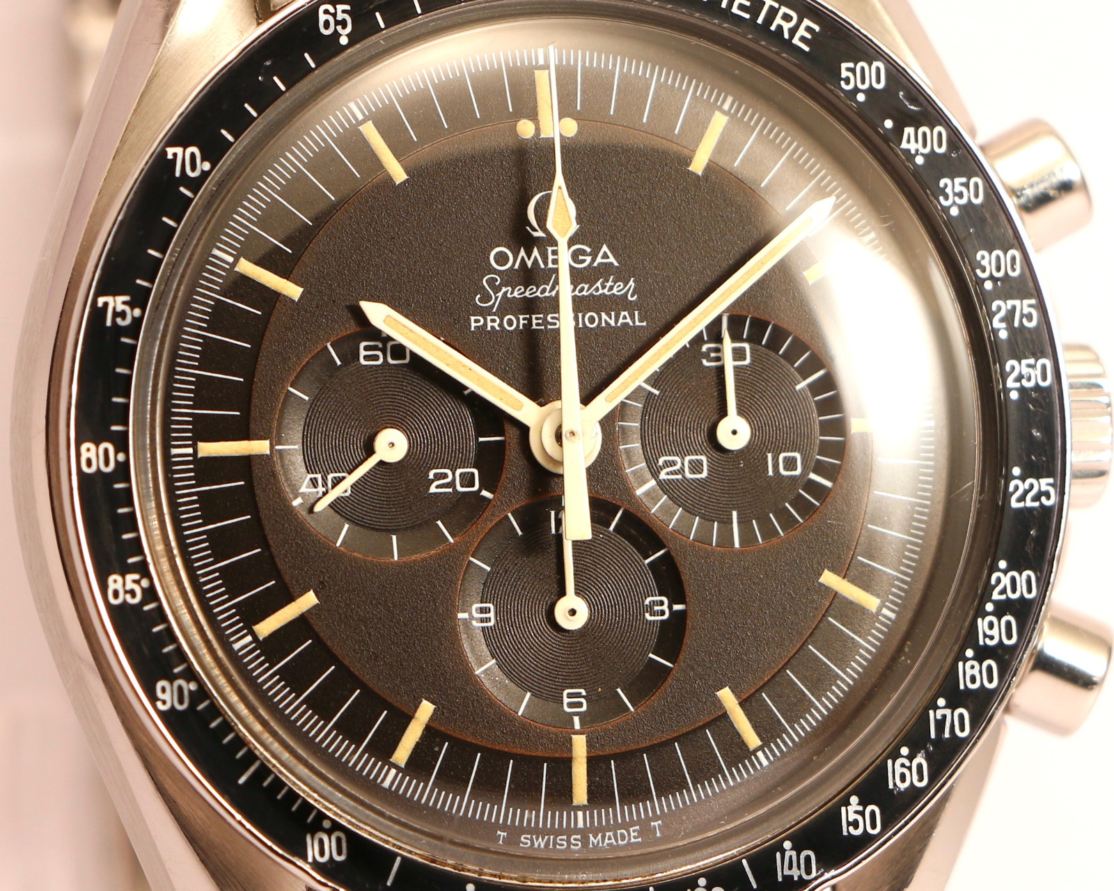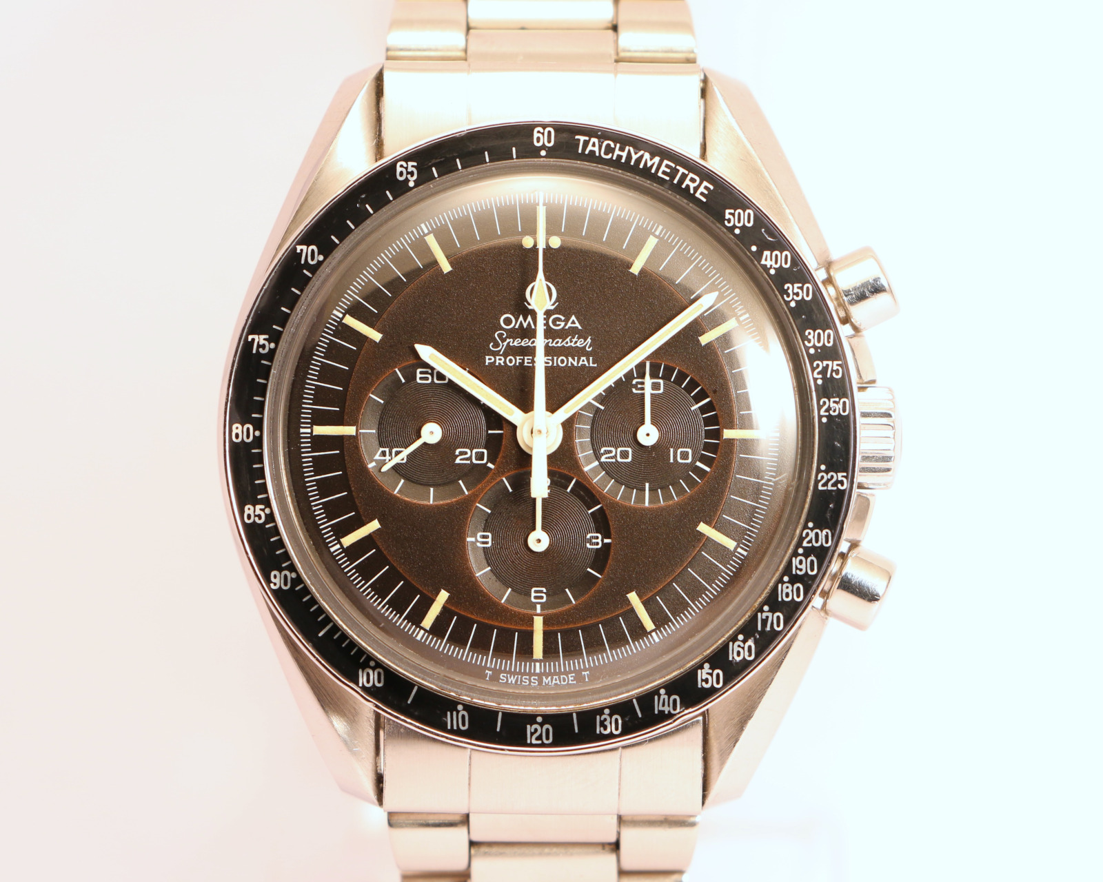 This example features a very rare dark brown “tropical” dial. The dial turned brown because of a defect in the composition of the zappon varnish, but only a few dials had this particularity. Tropical Speedmasters are highly sought after by collectors and going up in value.