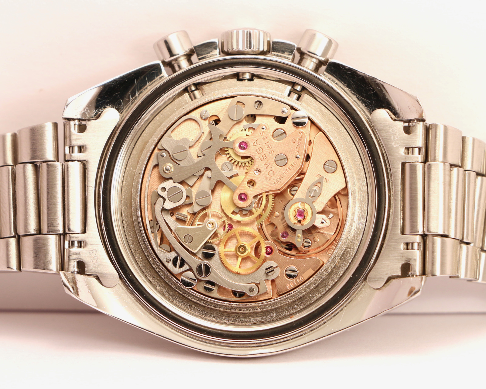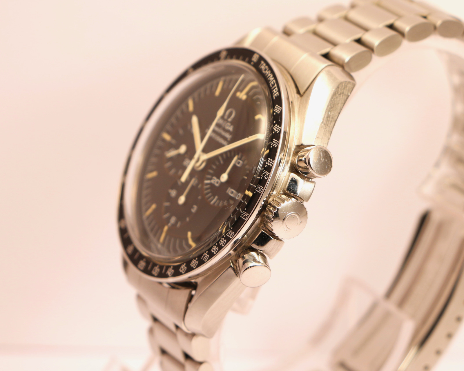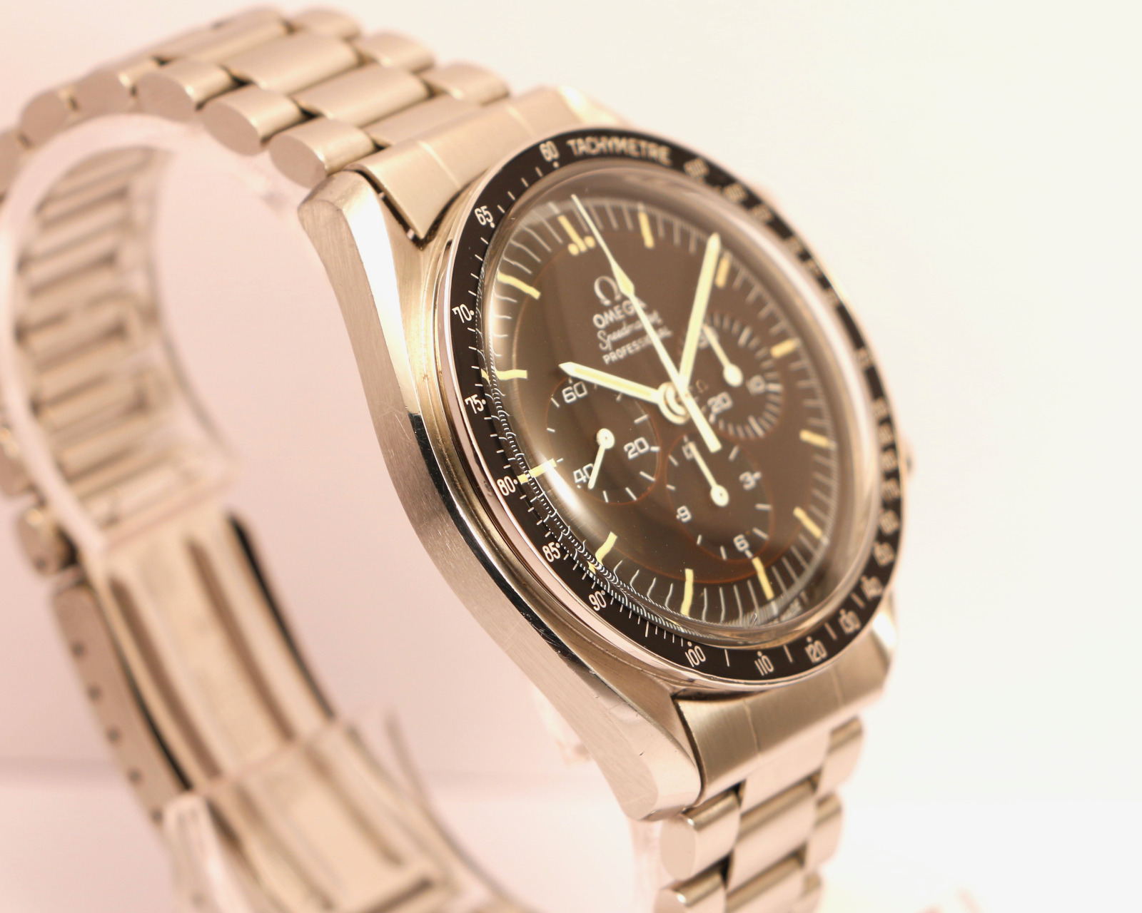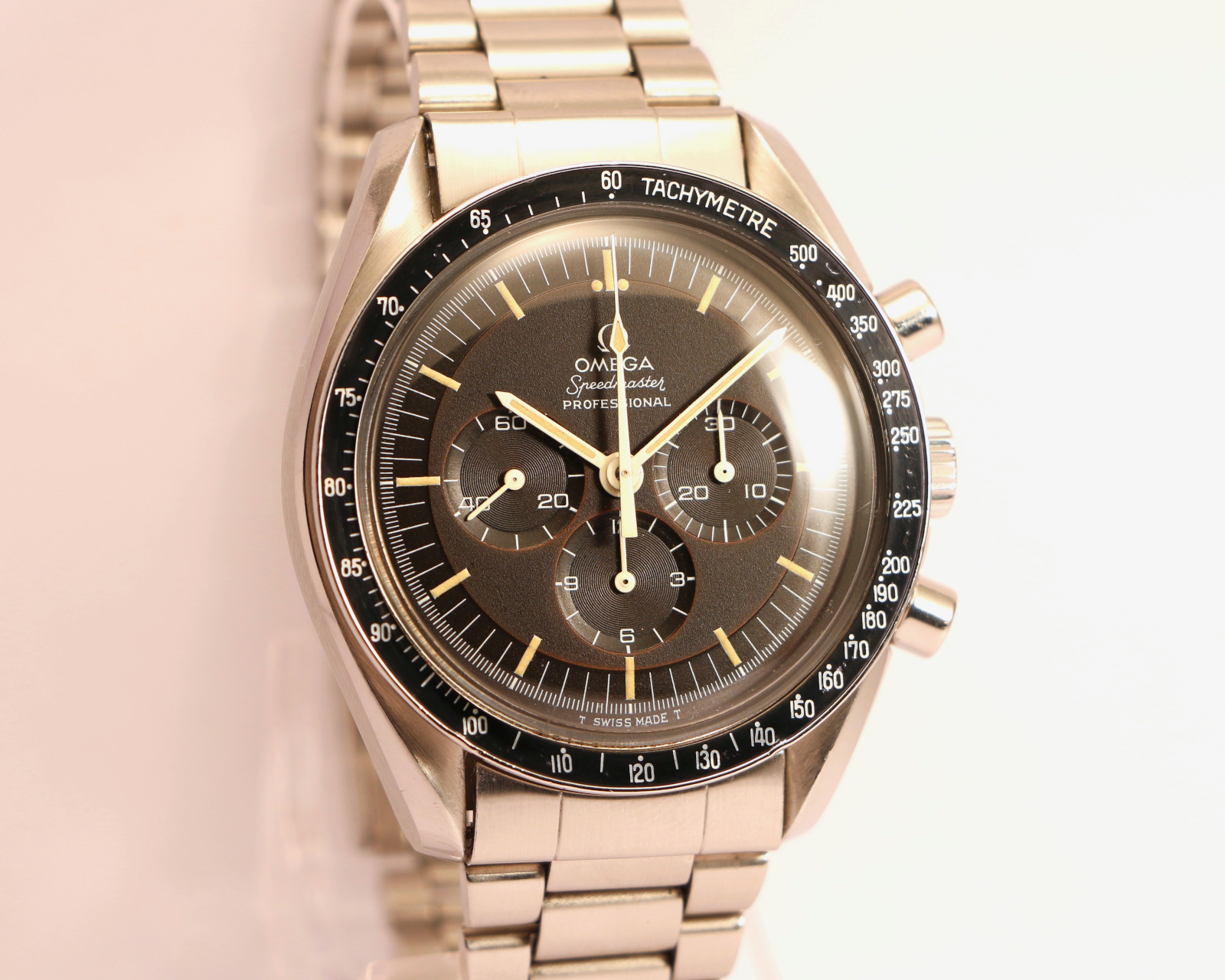 This example features a very rare dark brown “tropical” dial. The dial turned brown because of a defect in the composition of the zappon varnish, but only a few dials had this particularity. Tropical Speedmasters are highly sought after by collectors and going up in value.