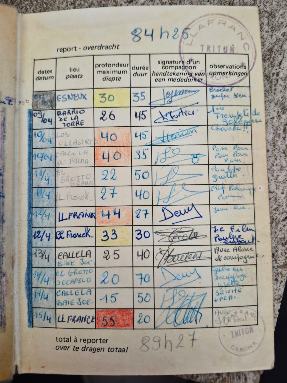 Ces derniers s’étendent sur plusieurs années et totalisent plus de 1000 heures de plongée. Ils sont enrichis de nombreuses annotations manuscrites d’époque : observations de faune, plongées de nuit, explorations d’épaves ou encore remarques spontanées.