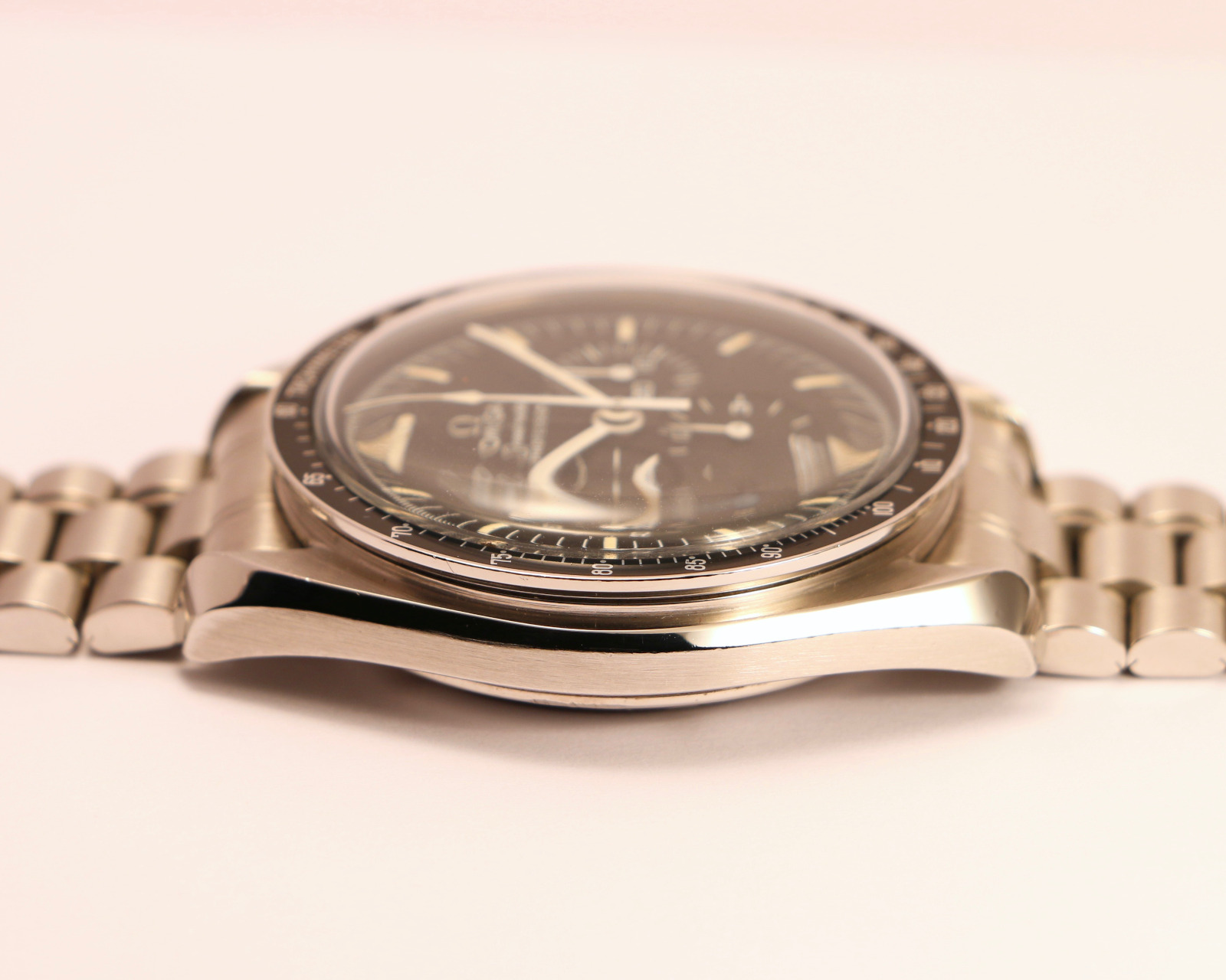 Cet exemplaire est intéressant car son plexi est légèrement bleuté, c'est très subtil et plus ou moins visible selon la luminosité. Il s'agit d'un rare défaut que l'on retrouve sur certaines Speedmaster de cette période. Parfois, les plexis ont développé une couleur bleue plus soutenue,cliquez ici pour en voir un exemple.